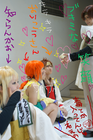 本日は万千さんの家に行ってきました そして武蔵森のユニフォを受け取ってきました 萌えす ばんちさんおさむさんほんまにありがとう まおさんは幸せで幸せで死にそうです ばんちさんの家では久々にばんちさんの姉さまと妹さまにも会ってきました ばんちさんの姉さまに「BASARAのかすがを着てくれ」と言われました ( Д ) ゜゜ では最も遊んでいるやつらの記の速報らしきものいきます 一応ネタは隠しますねー ほんまこの日は幸せでした 三蔵がきゅるるん(タヒ)で可愛かったり 悟空と李厘のテンションが本物だったり 八戒の黒笑顔が炸裂したり うんうん、ほんま幸せでした← 同日にしたマンキンはまた後日 いつかばんちさんリゼルグ着てーマルコ(だっけ)着るからー>ばんちさん 玄奘三蔵法師:神酒 孫悟空:コモリタクミ 猪八戒:万千百 沙悟浄:舞桜 李厘:クロ 以下ネタにつき次ページ 2008/07/31(Thu) 00:45:55